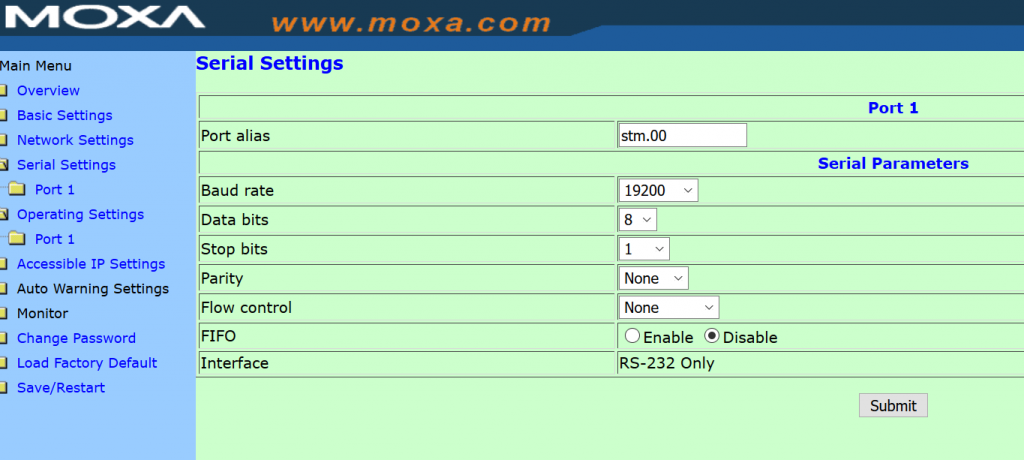 Moxa NPort 5110 (Nach Anleitung von Jo konfiguriert) 192.168.0.30 TCP Port 10000
